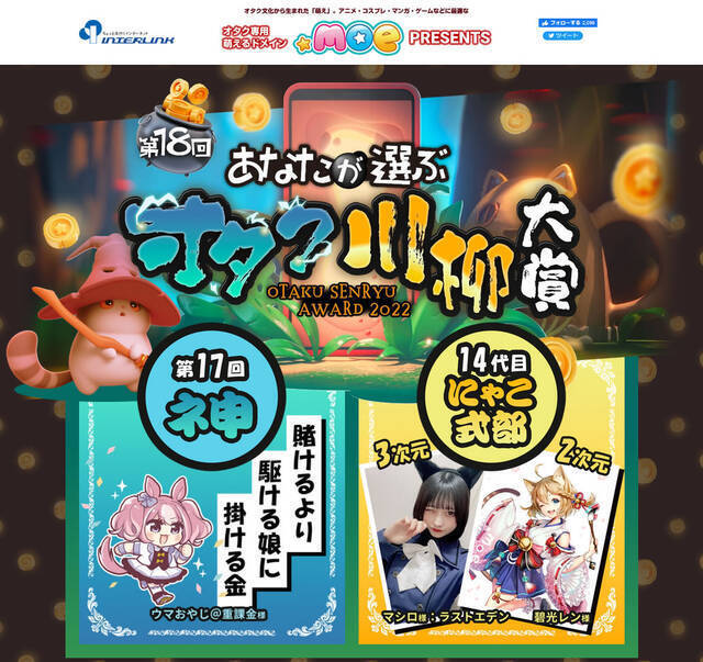 「オタク川柳」は、2005年に開催した、インターリンク10周年記念企画「IT川柳大賞」から始まり、2008年開催の第4回より「オタク川柳大賞」にリニューアル。2014年開催の第10回からはオタクのための萌えるドメイン「.moe」プレゼンツとして開催しています。「聞いてない 誰もそこまで 聞いてない」(Vmax:30代)、「好きな子を 奪い合わずに 語り合う」(彦根英雪・10代)、「デュフフコポォ オウフドプフォ フォカヌポウ」(文郎・20代) などの名作は、今もなおSNS上で話題になることがあり、決して色褪せることのないオタク川柳の中のオタク川柳です。ネ申(大賞)に選ばれた受賞者には賞金10万円、2位以下の各賞「天才(優秀賞)」「職人(佳作)」「特別賞」には、賞金または賞品が授与されます。 前回大会(第17回)では、「賭けるより 駆ける娘に 掛ける金」(ウマおやじ@重課金:40代)が、ネ申賞(大賞)を受賞致しました。