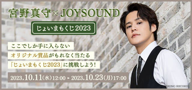 株式会社エクシングが展開する JOYSOUND の web サイト「こんぷくじ」では、声優・アーティストの宮野真守のライブツアー『MAMORU MIYANO LIVE TOUR 2023~SINGING!~supported by JOYSOUND』の開催にあわせ、オリジナル賞品がもれなく当たる『じょいまもくじ2023』〔1 回 660 円(税込)〕の販売を、10 月 11 日(水)正午からスタートします。