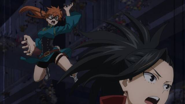 多種多様なキノコの胞子を放出するB組の小森希乃子の“個性”や、巨大文字を出現させる吹出漫我の“個性”により形勢が逆転。そこに、拳藤一佳(CV.小笠原早紀さん)が“個性”大拳で、八百万に近接戦闘を挑みます!