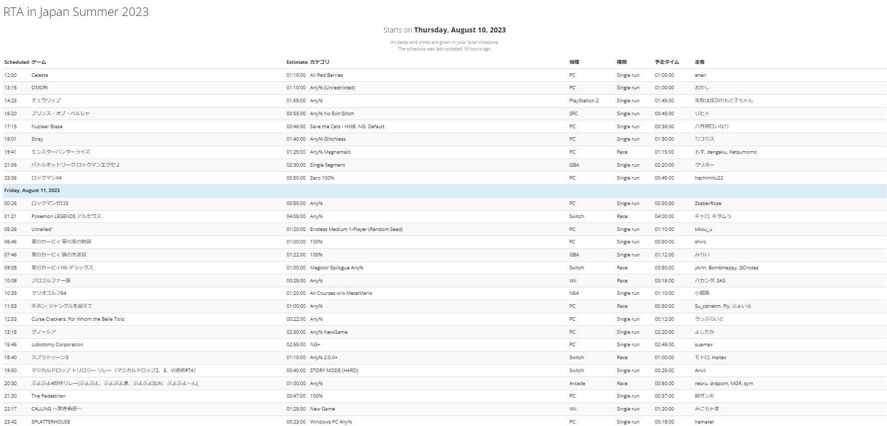 なお、実際にイベントが始まると各ゲームの開始時刻は進行状況によって前後します。スケジュールはリアルタイムで変更いたしますので、こまめに時間をご確認ください。 https://t.co/DSAgaKKzwn #RTAinJapanRTA in Japan (@RTAinJapan) July 16, 2023