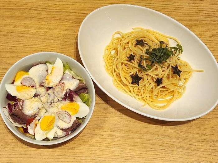 FYA’M’たらこクリームパスタは「クリーム」とついていますが、大葉や海苔が乗っていてさっぱりめなお味。こういったカフェメニューでは珍しい、サラダオンリーのフードもたくさん食べたいけどカロリーが気になる……という人に嬉しいメニューです。