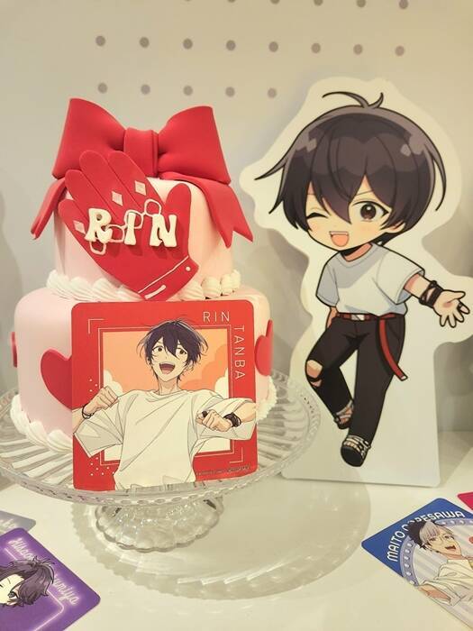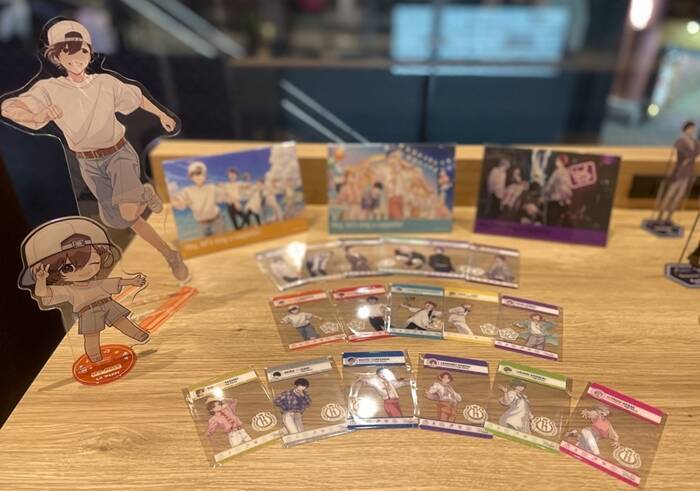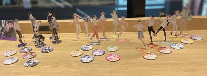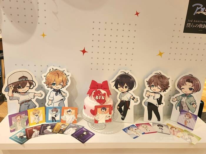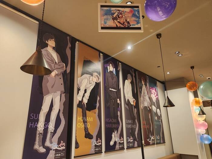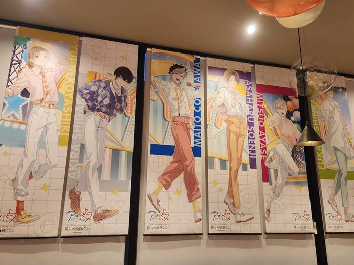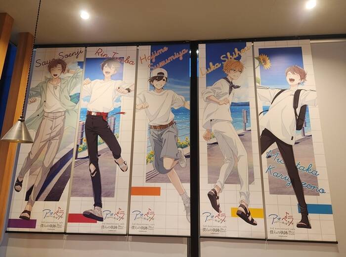 東京・池袋のグランドスケープ池袋2階「THEキャラCAFE」にて開催中の、『アオペラ -aoppella!?- 3rd Anniversary cafe 僕らの軌跡 -our tracks-』先行体験会。『アオペラ』3周年のお祝いということもあって、店内にはタペストリーやバルーン、ガーランド風の写真装飾のほか、グッズも展示されていました。
