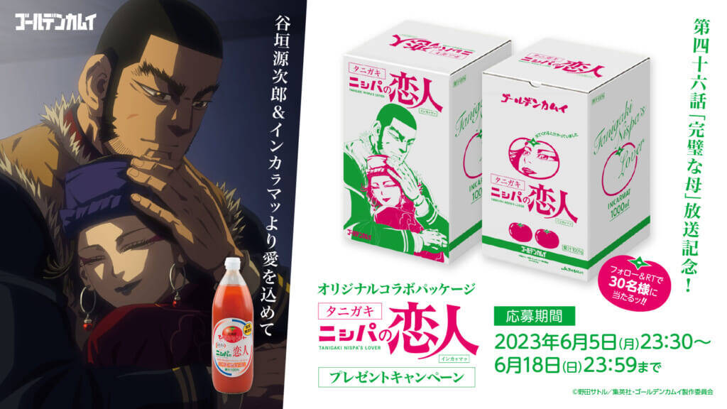 アニメ『ゴールデンカムイ』第46話「完璧な母」の放送を記念して、北海道・平取町特産トマトジュース「ニ(シ)パの恋人」のオリジナルコラボパッケージ1L瓶を抽選で30名にプレゼントするキャンペーンが、アニメ公式Twitterアカウント上にて開始された。
