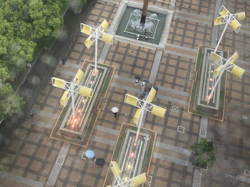 ゴンドラがある程度高い位置まで上がると、曇り空だが、思ったよりも遠くまで視界が広がった。2025年に開催される予定の万博の会場・夢洲も見えた。巨額の建設費を投じて作られている木造の大屋根がかすかに「あれがそう、かな?」という頼りなさで見えた。