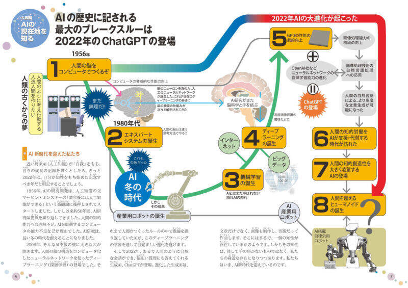 シリーズ第31弾となる今回はAI(人工知能)にフォーカス。AIの歴史からChatGPTの仕組みなどの基礎知識、そして、これからますます進化していくAIと人類との未来を、14歳から大人までを読者対象に、カラー図版満載で解説しています。