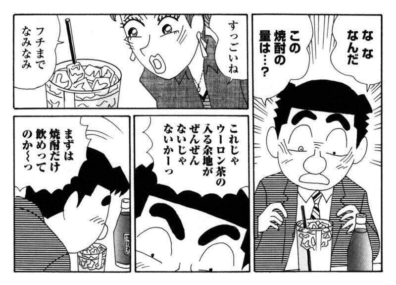 「な な なんだ この焼酎の量は…? これじゃウーロン茶の入る余地がぜんぜんないじゃないかーっ」