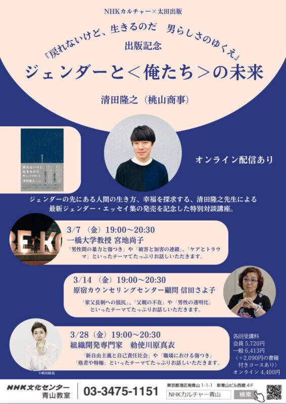 太田出版とNHK文化センターとのコラボレーション企画が初登場! 第一弾となる今回は、清田隆之さん(桃山商事)による最新ジェンダー・エッセイ集『戻れないけど、生きるのだ 男らしさのゆくえ』の発売を記念して、豪華ゲストを招いた特別対談講座が開催されます。