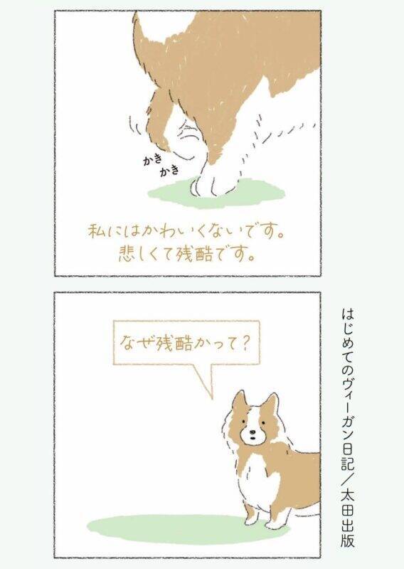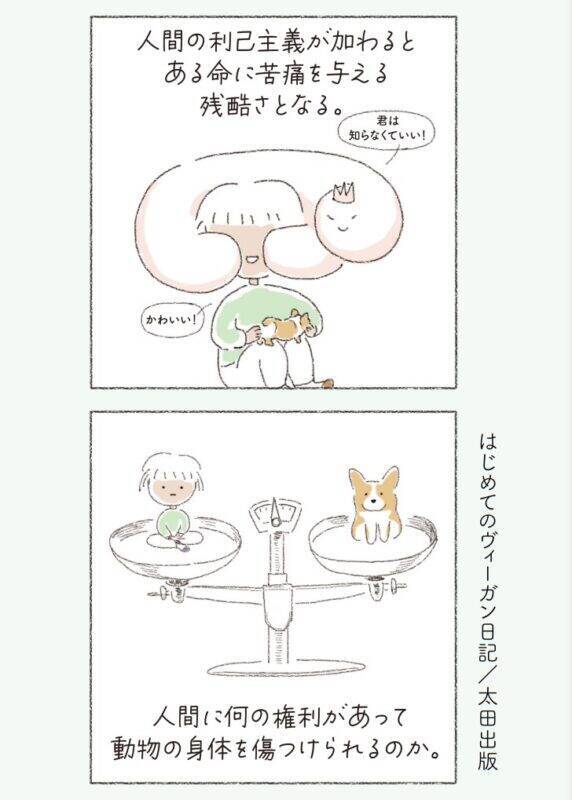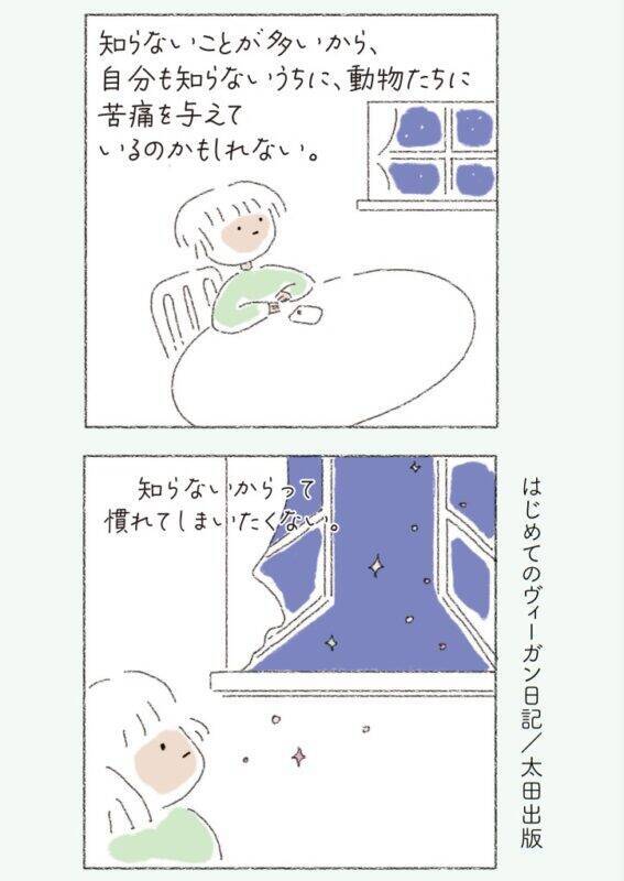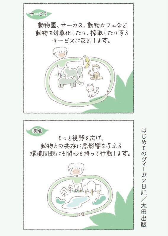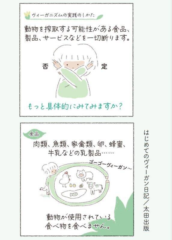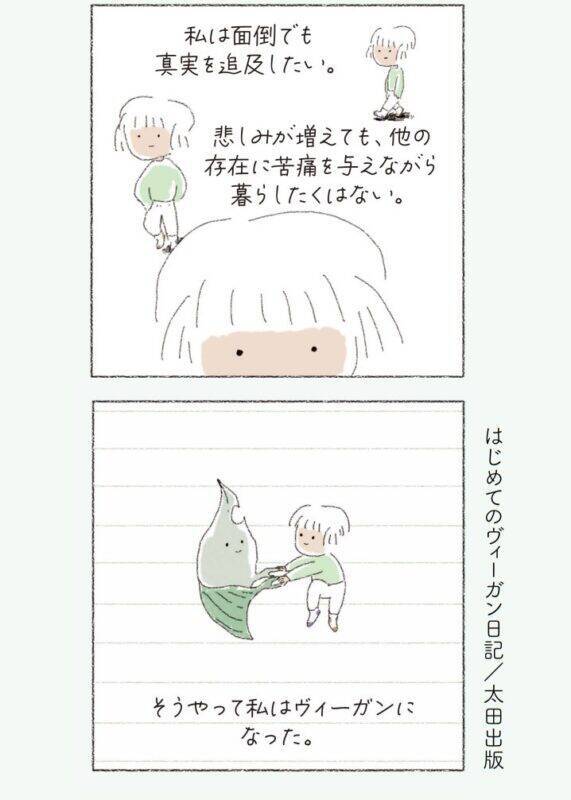 まわりの友人のリアクションや、菜食を始めてから変わったライフスタイルなど、ヴィーガンの日常生活をやさしいタッチのイラストで描きます。「なぜヴィーガンが環境にいいの?」「食べるものに苦労しない?」といった身近な疑問から、動物の権利など菜食の理論について、初めての方にもわかりやすく紹介する、ヴィーガン入門にぴったりの一冊です。