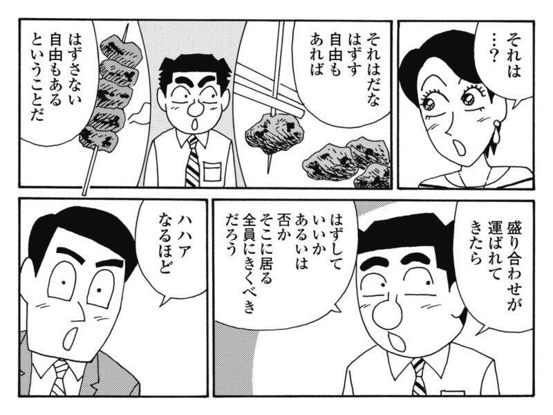 『酒のほそ道』45巻第6話「はずす問題(後編)」©ラズウェル細木/日本文芸社『酒のほそ道』45巻では、前編・後編の2話にわたって、焼き鳥や焼きとんなど、串に刺さった状態で提供されるものを「はずす」か「はずさないか」という問題について考察している。