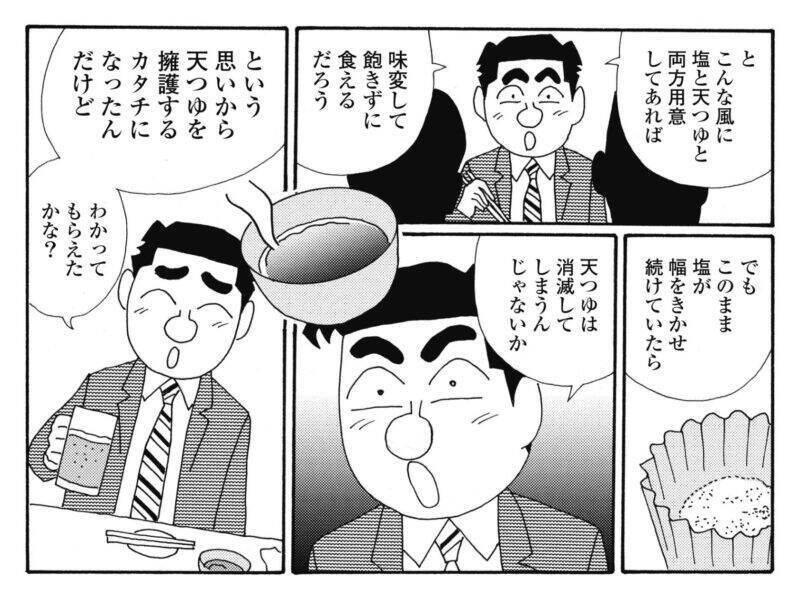 「このまま塩が幅をきかせ続けていたら 天つゆは消滅してしまうんじゃないか」と目を見開く宗達が大げさに見えて笑ってしまいそうになるが、彼にとってこれは、大事な食文化が失われかねない危機なのである。