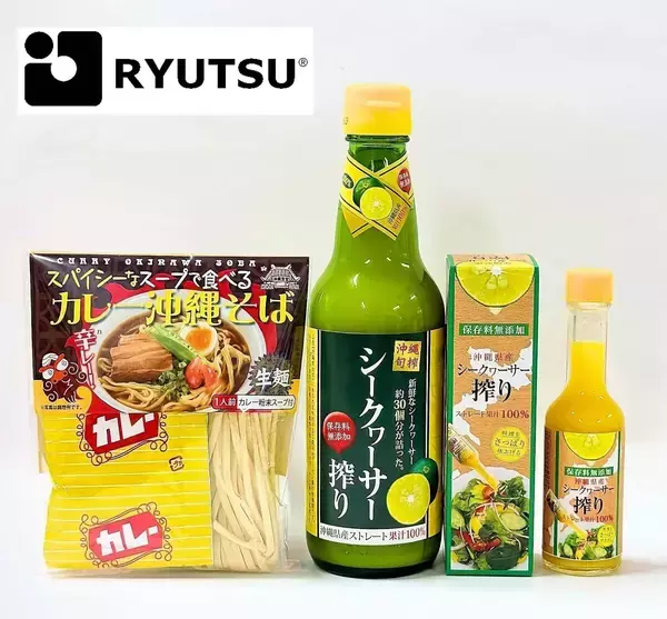 琉津の(左から)「スパイシーなスープで食べるカレー沖縄そば」(298円)「沖縄旬搾シークヮーサー搾り360ミリリットル」(1180円)「同60ミリリットル」(537円)