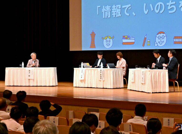 授業で新聞の社説を活用する取り組みに関心があった。言葉の使い方はもちろん、世の中の状勢を生徒に伝えるための導入として、社説を生かすことができる。ページをめくることで、多くのニュースに出合えるのが新聞の長所だと感じた。(首里高教諭)「情報で、いのちを守る」をテーマに選挙や災害報道の在り方について意見交換する司会の池上彰さん(左端)とパネリスト=7月31日、神戸市中央区・神戸ポートピアホテル・ポートピアホール">