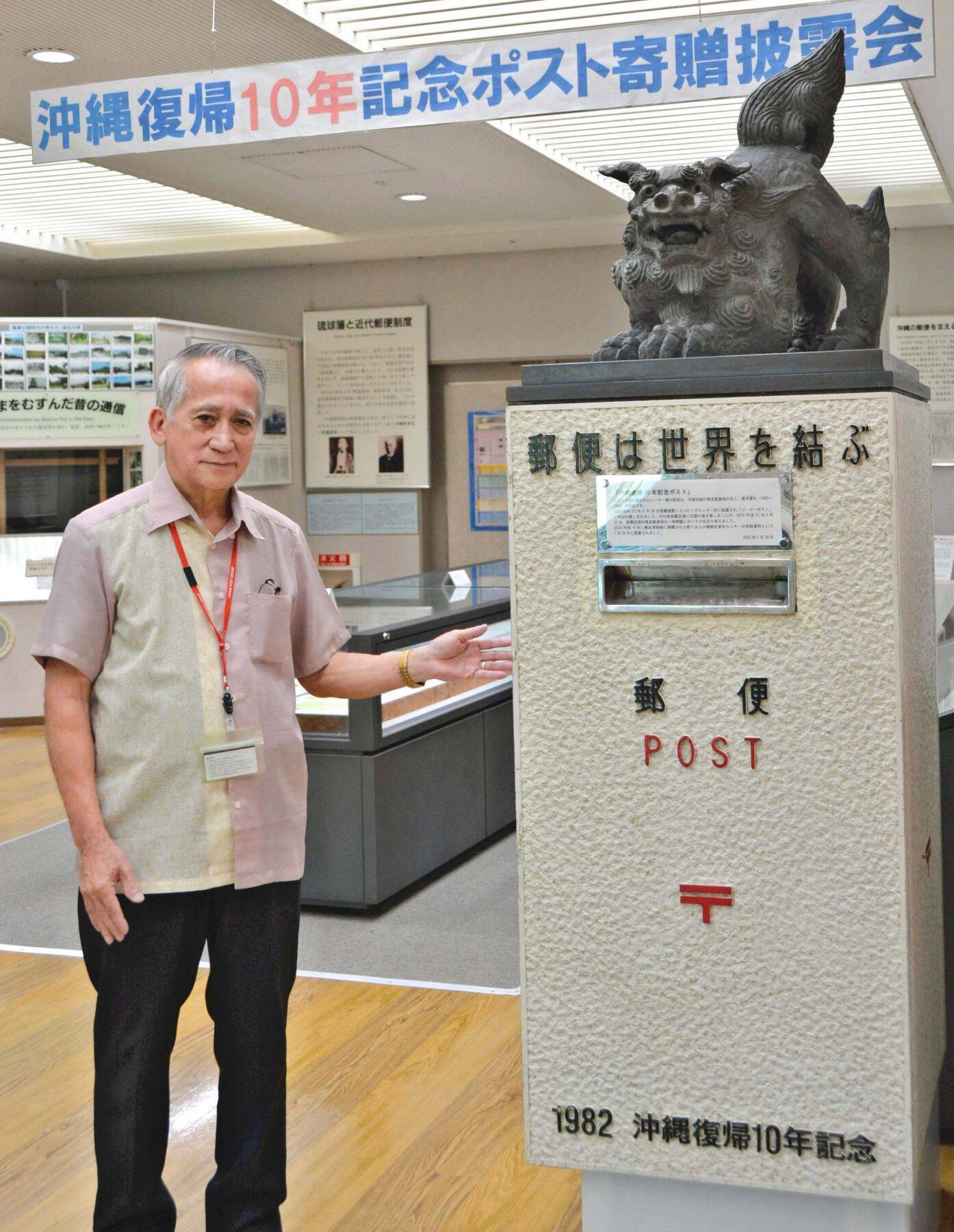 ポストは高さ160センチで白色。シーサー作りの第一人者、故島常賀さんが制作した高さ約50センチのシーサーが上に乗り、「1982年 沖縄復帰10年記念」と記されている。