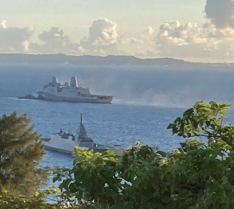 煙が上がっている米艦船「ニューオーリンズ」=20日午後6時45分ごろ、うるま市勝連平敷屋(読者提供)
