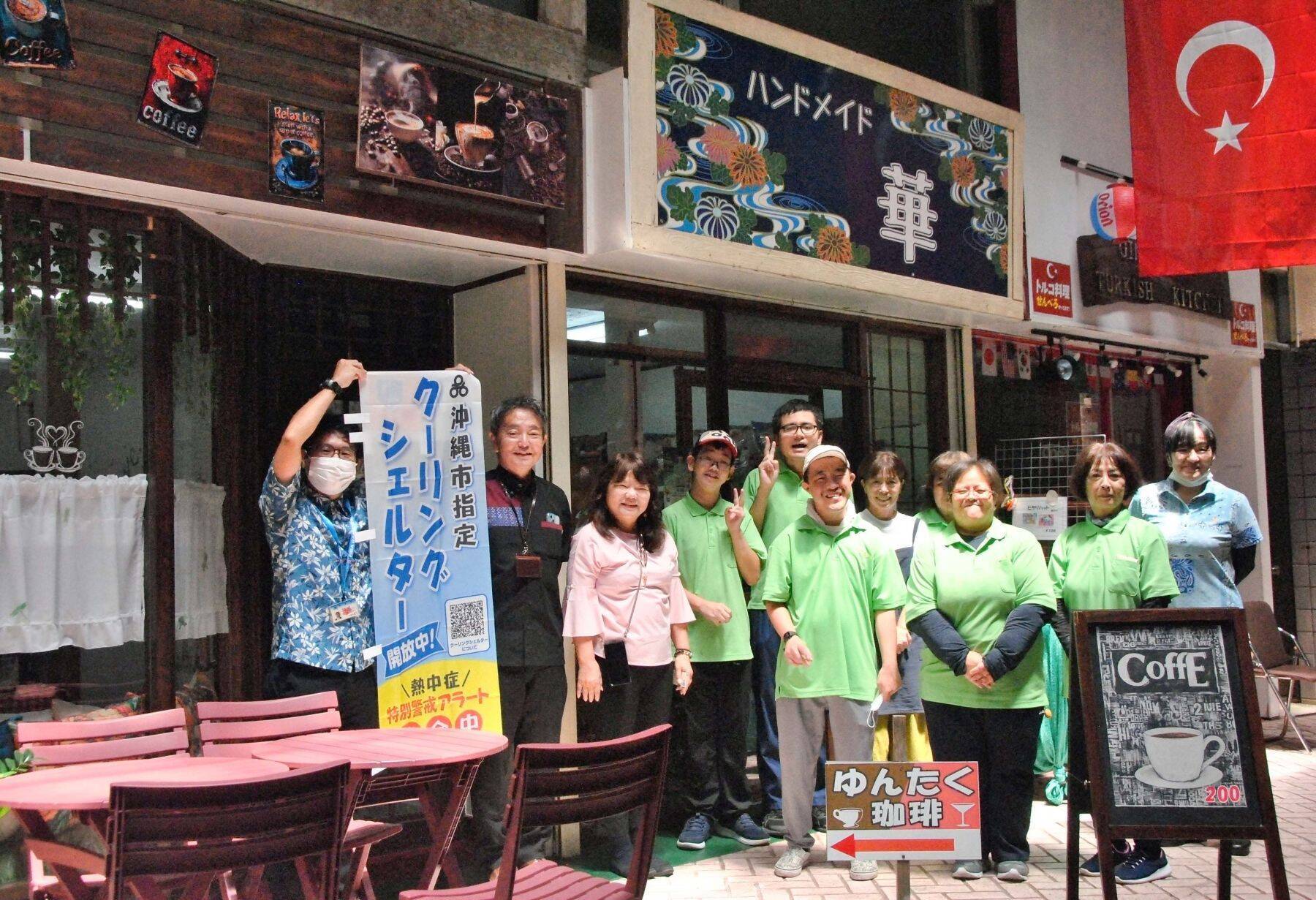 シェルターの正式名称は「指定暑熱避難施設」。沖縄市は本年度から、民間施設の募集を始めた。災害級の熱波に備えて熱中症特別警戒アラートが発令された場合、「クーリングシェルター開放中」と書かれたポスターを張り、冷房の効いた場所など通行人が暑さをしのぐための場所を開放する。運用は10月22日まで。