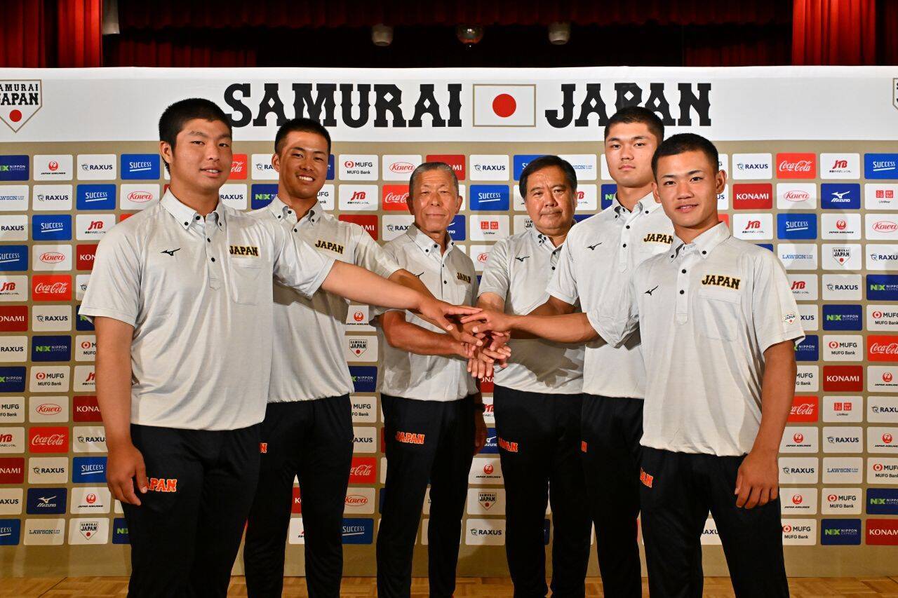 大会に向けて意気込む侍ジャパンU18の(左から)末吉良丞、中野大虎、小倉全由監督、寶馨会長、阿部葉太、岡部飛雄馬=30日、那覇市・ロワジールホテル那覇(喜屋武綾菜撮影)">