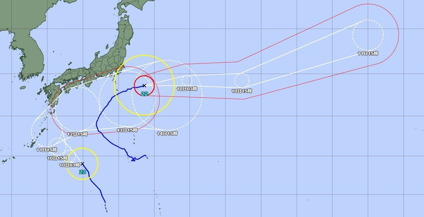 台風23号は11日にかけて沖縄地方・奄美地方に近づいた後、台風22号の後を追うように急カーブして進路を東寄りに変え、12日には暴風域を伴いながら本州の南海上を進む見通し。