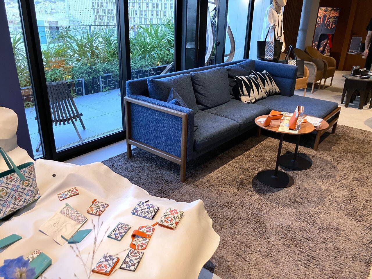 最上階のペントハウススイートで開かれている琉球びんがたレザーブランド「Bin.」の発表・受注販売会