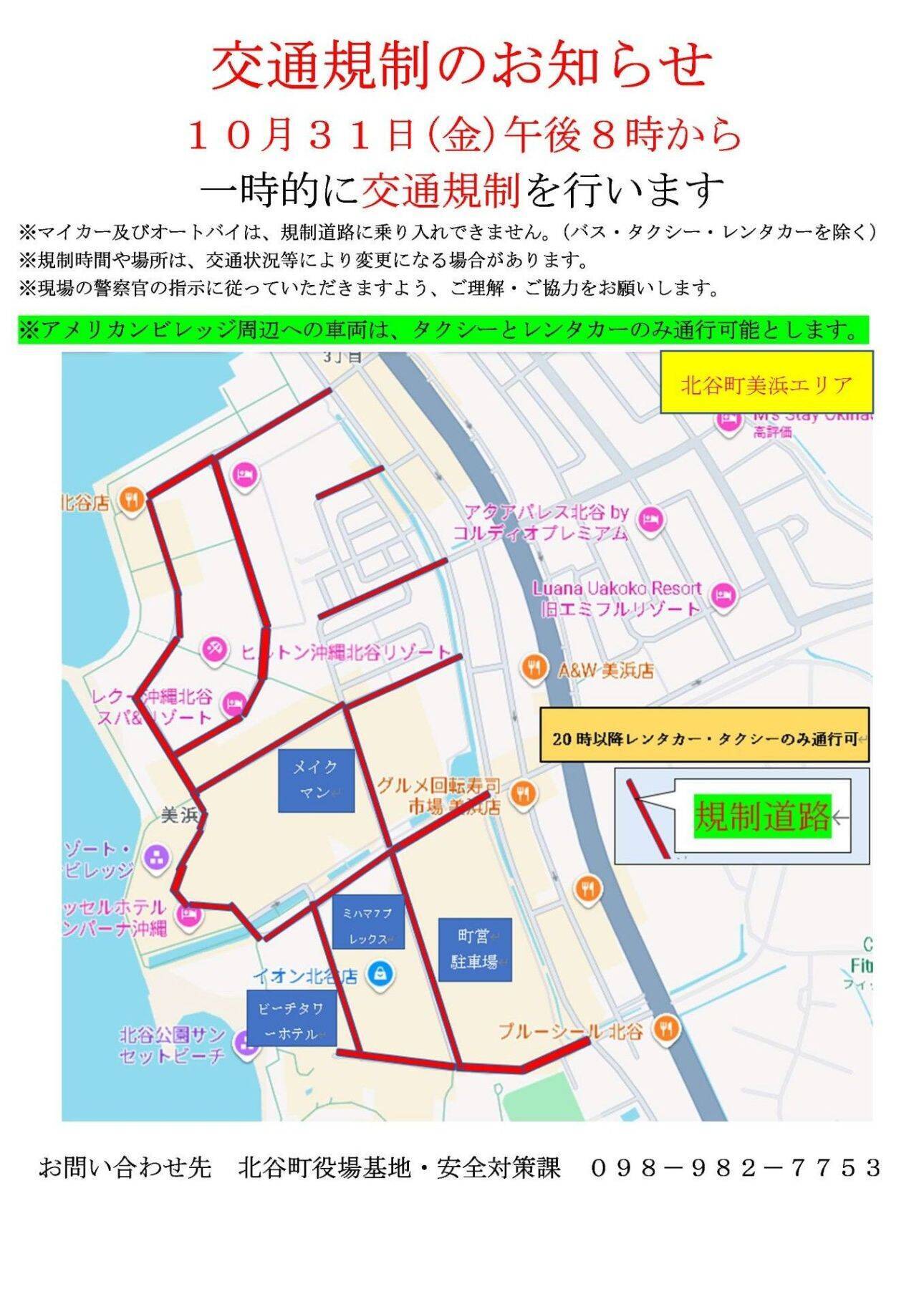 2025年10月31日(金)20時~11月1日(土)未明にかけて、美浜アメリカンビレッジ周辺では、ハロウィンに関連して多数の来訪者が見込まれることから、歩行者の安全確保と交通の円滑な運用を目的とした交通規制を実施いたします。