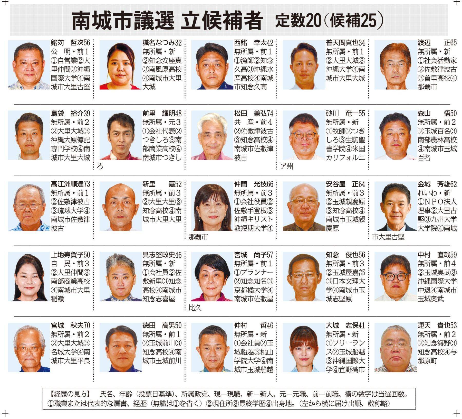 南城市議会は9月26日、市長による市職員に対するセクハラ問題で4度目の提出となった不信任決議案を賛成多数で初めて可決。古謝市長は辞職せず、10月6日に市議会を解散した。市議の本来の任期は来年9月までだった。