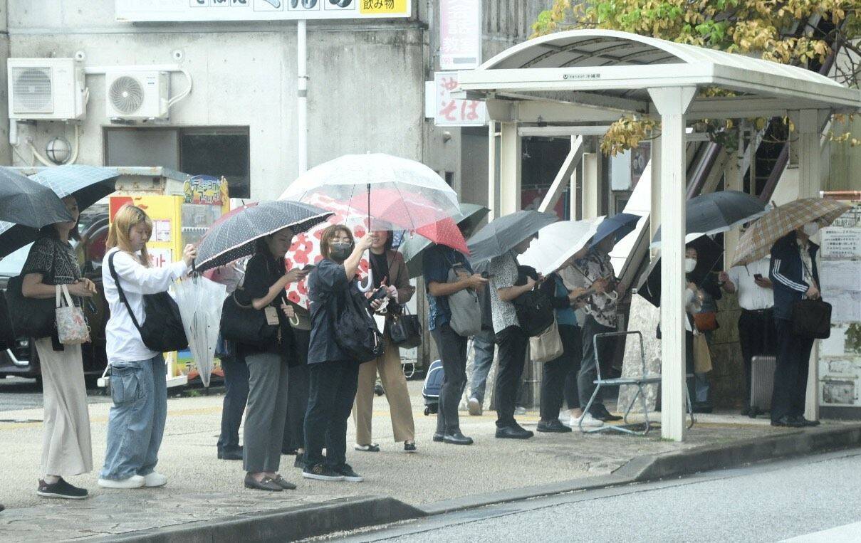 那覇市の首里駅ではバスに乗り換える人たちの長い列ができている。