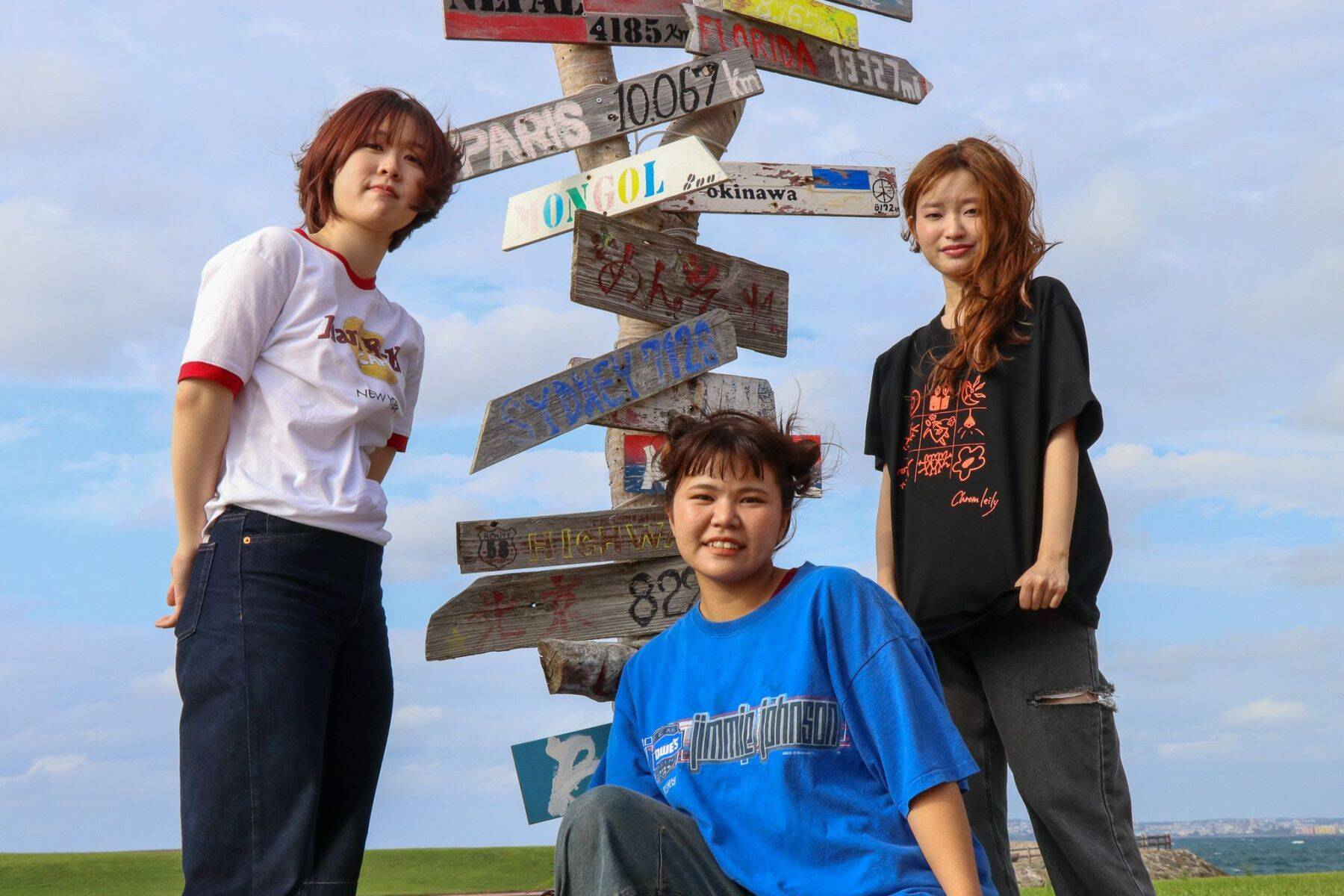 クロムレイリーの(左から)ゆか(サポートDr.Cho)、ももか(Gu.Vo)、りの(Ba.Cho)=10月26日、宜野湾市内">