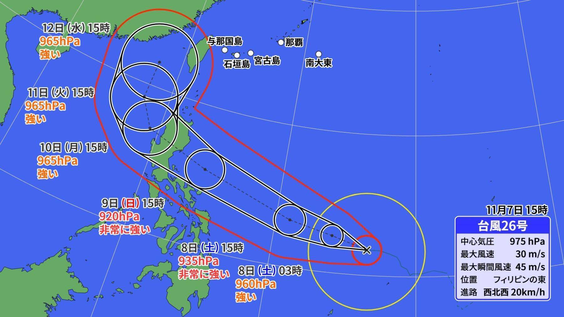 11月7日(金)午後3時現在、台風26号はフィリピンの東にあって、1時間に20km/hの速さで西北西へ進んでいます。中心気圧は975hPa、中心付近の最大風速は30m/sで暴風域を伴っています。暴風域は全域で110km、強風域は全域で440kmです。