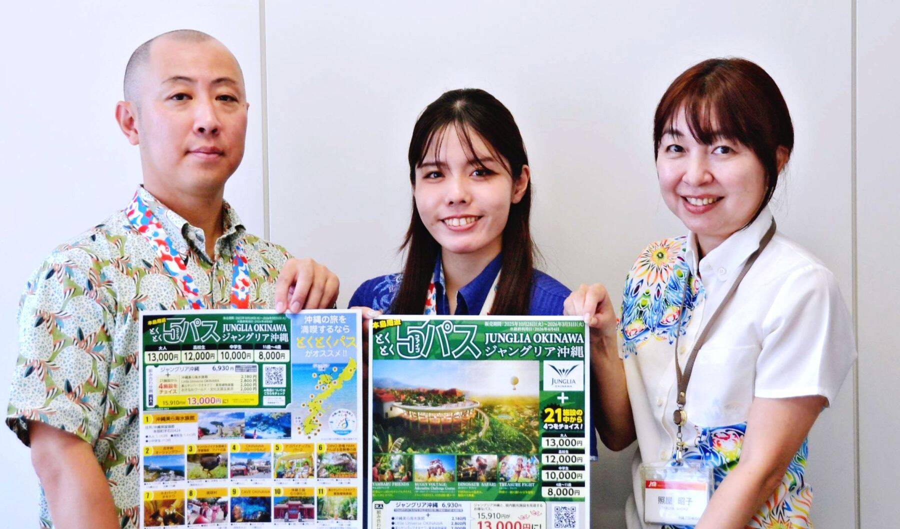 周遊券にはジャングリア沖縄の入場券とともに、本島内の21カ所の観光施設から旅行者が選んだ4施設の入場券が付く。価格は大人(18歳以上)1万3千円、高校生1万2千円、中学生1万円、4歳~11歳8千円。