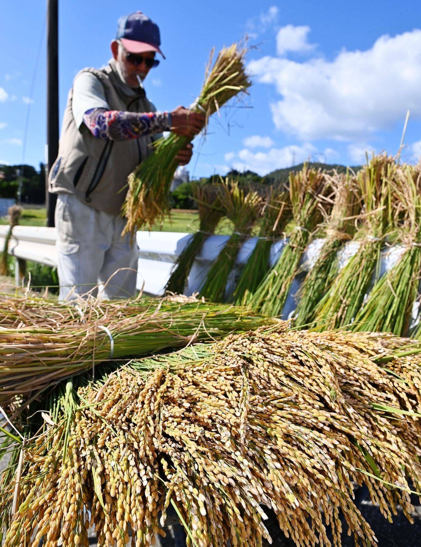 刈り取った稲を束ね天日干しの作業をしていた男性(64)は「無農薬で作っている。来週は天気が崩れそうだから早めに収穫しているよ」と笑顔で話した。(写真部・喜屋武綾菜)