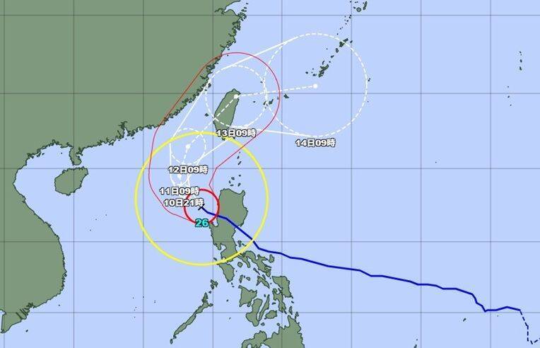先島諸島で10日に予想される最大風速は17メートル、最大瞬間風速は30メートル。波の高さは5メートルでうねりを伴う。進路によっては11日にかけて大しけとなる恐れがあり、11日は激しい雨が降るところがある見込み。11日から14日にかけて警報級の大雨となる可能性がある。