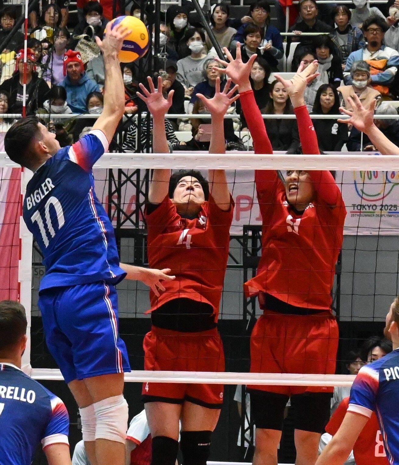 相手のスパイクのブロックに跳ぶ眞謝茂伸(中央)=18日、東京・駒沢オリンピック公園体育館(大庭紗英撮影)