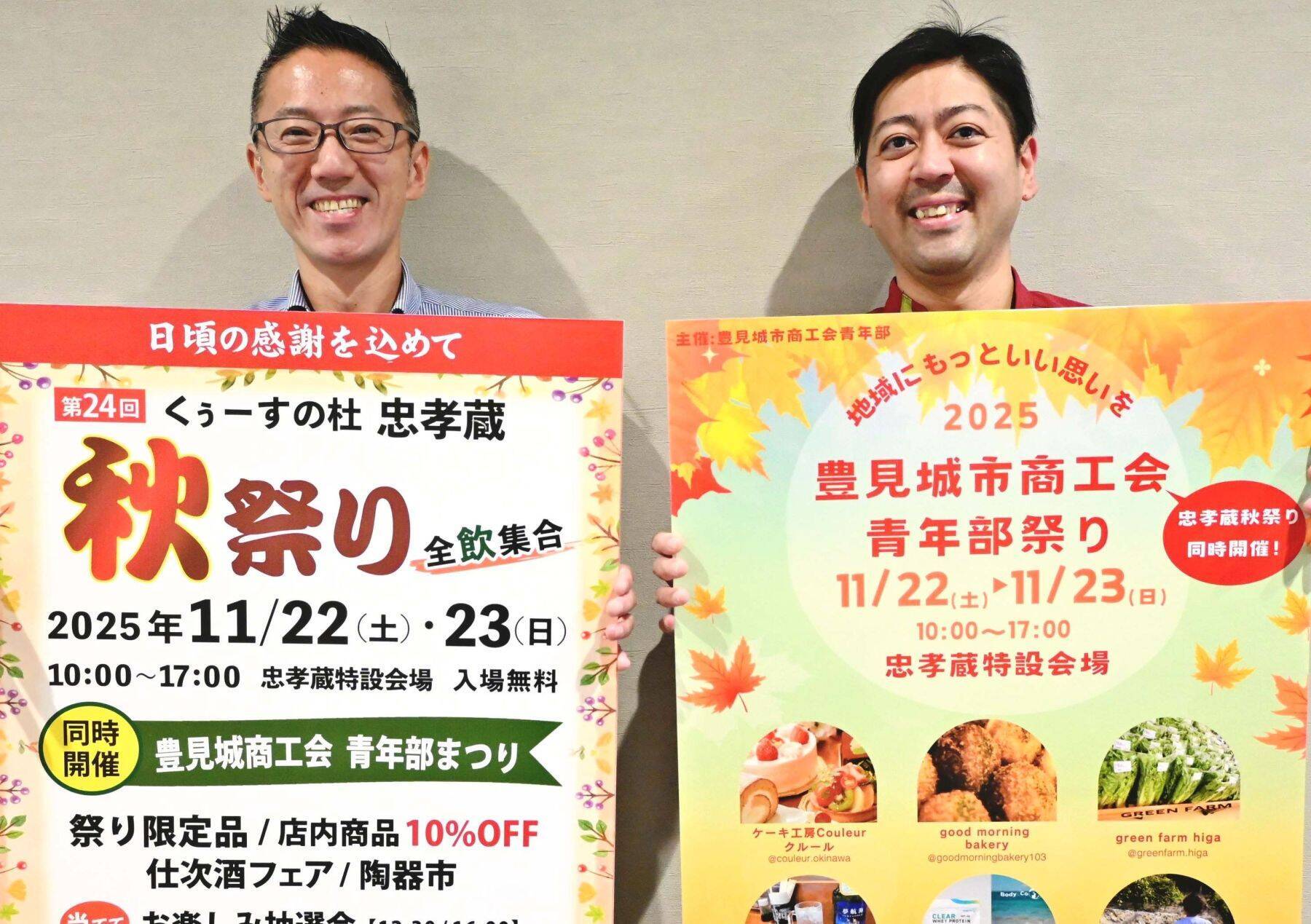 (写図説明)「くぅーすの杜忠孝蔵」秋祭りへの来場を呼びかける忠孝酒造の黒野真樹氏(左)と豊見城市商工会青年部の仲西竜太郎氏=18日、沖縄タイムス社