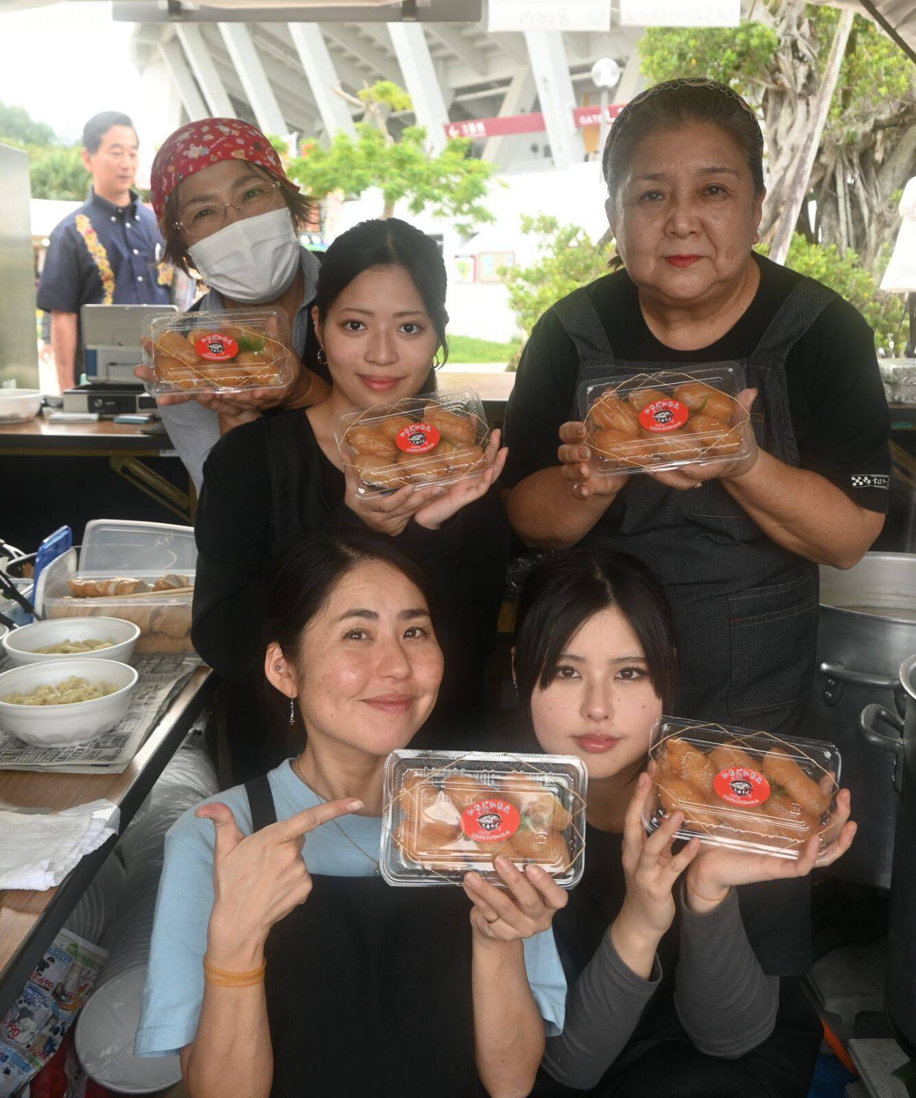 南大東村のカジキマグロを使った大東寿司をPRする「大東そば いちごいちえ」店主の喜友名末子さん(右上)ら=21日、那覇市の沖縄セルラーパーク那覇