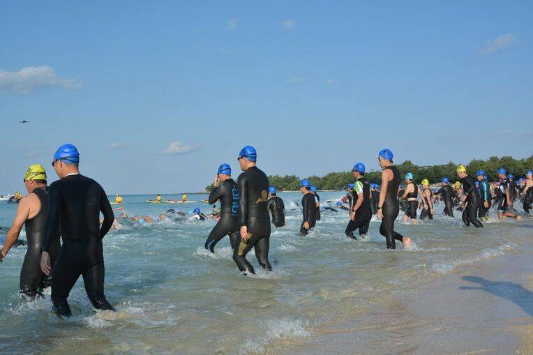 好天に恵まれ、号砲とともに、ウェットスーツに身を包んだ参加者が潮止まりの穏やかな海に向けて一斉に飛び込んだ。