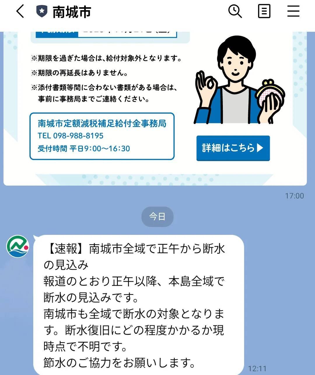 節水を呼びかける南城市のラインのスクリーンショット">