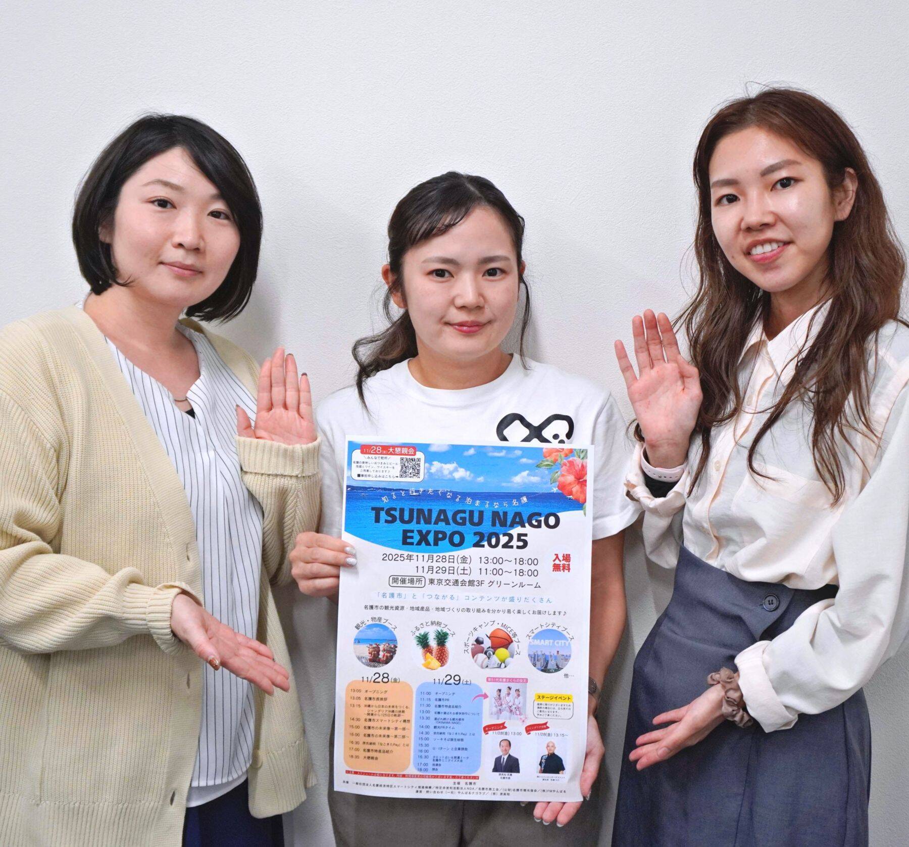 第51代名護さくらの女王によるクイズもある。イベントに関わるやんばるナゴラブの岸本知紗さん=写真中央=は「名護好きの方やこれから名護を知りたい人たちに来場してほしい」とPRした。