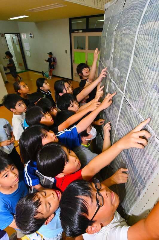 贈呈式は13日、東京都内で開かれる。「平和の礎」(沖縄県糸満市)の刻銘者が掲載された紙面から、親族などの名前を探す児童ら=6月18日、那覇市古島・松島小学校(宮城貴浩撮影)">