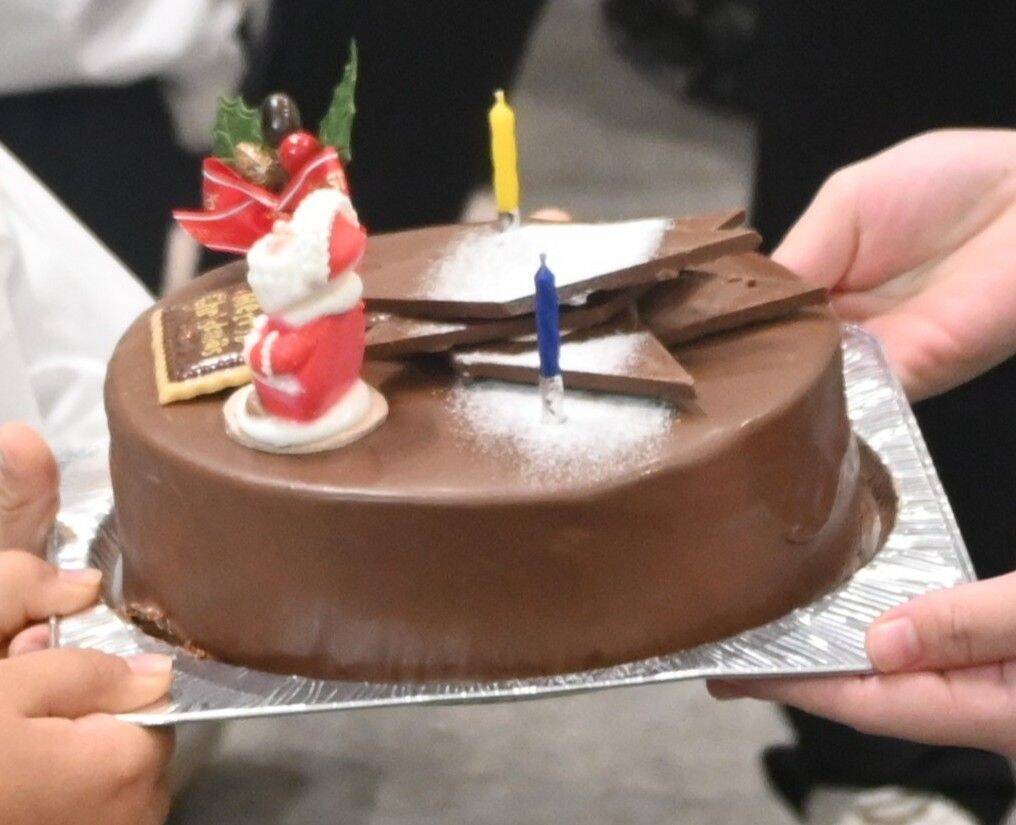 贈呈式で同協会の諸見晃会長は「愛情込めて作ったので、おいしく食べてほしい」とあいさつ。クリスマス仕様に飾りつけたチョコレートケーキを作った専門学校大育の知念舞さん(19)は「子どもたちが喜んでくれてうれしい」と話した。