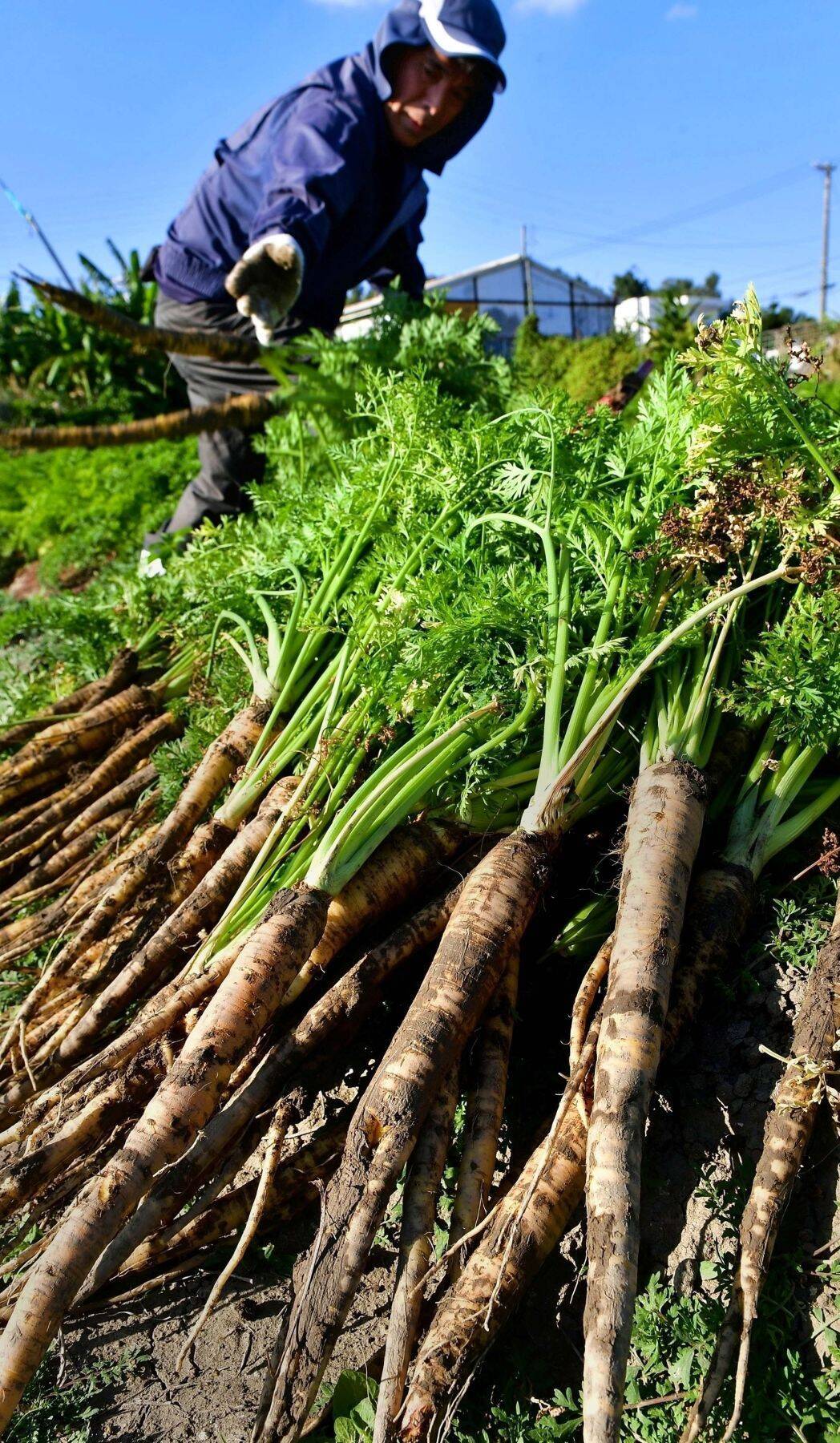 中城村では、特産の島ニンジンの収穫が始まっている。青空の下、作業をしていた生産者の男性は「昨年に比べて収穫量も増えて味もいい」と話した。
