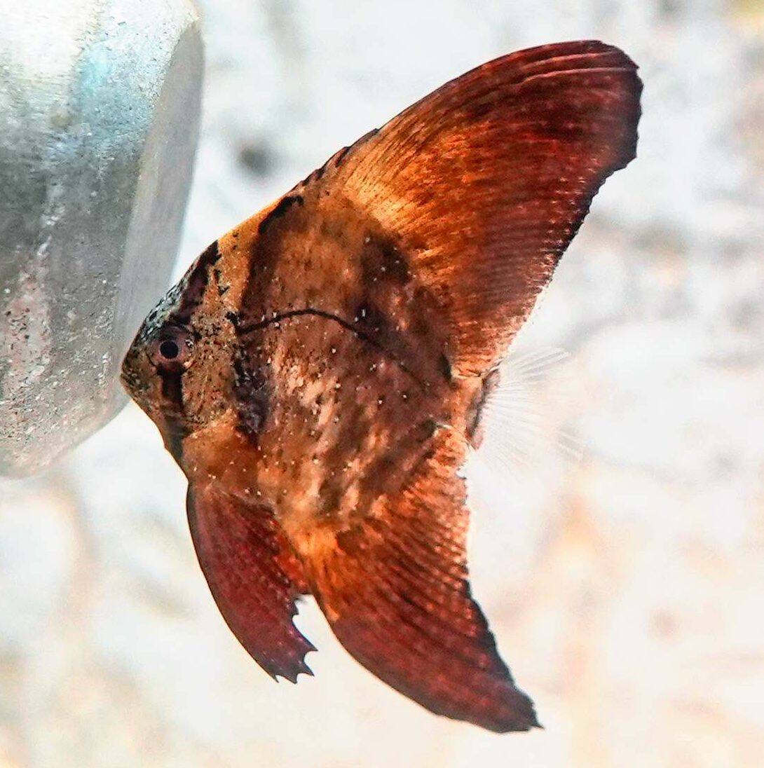 9月中旬、水槽の底に沈む卵を飼育員の福地伊芙映(いふえ)さんが回収した。一般に水底に沈む卵は死んでしまったものが多いが、回収後間もなくふ化。2週間ほど透明に近いコンペイトーのような形で水底を泳いでいたが、その後の2日間で急激に形態が変化し、現在の枯れ葉のような形になったという。