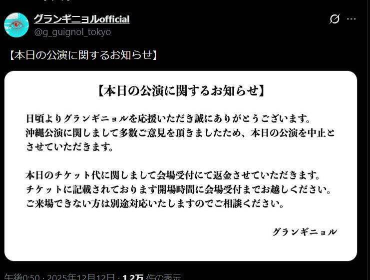 公式アカウントは、公演中止の理由について「多数ご意見を頂きました」と説明した。チケット代は返金するという。本紙はバンドメンバーに取材を申し込んだが、応じなかった。