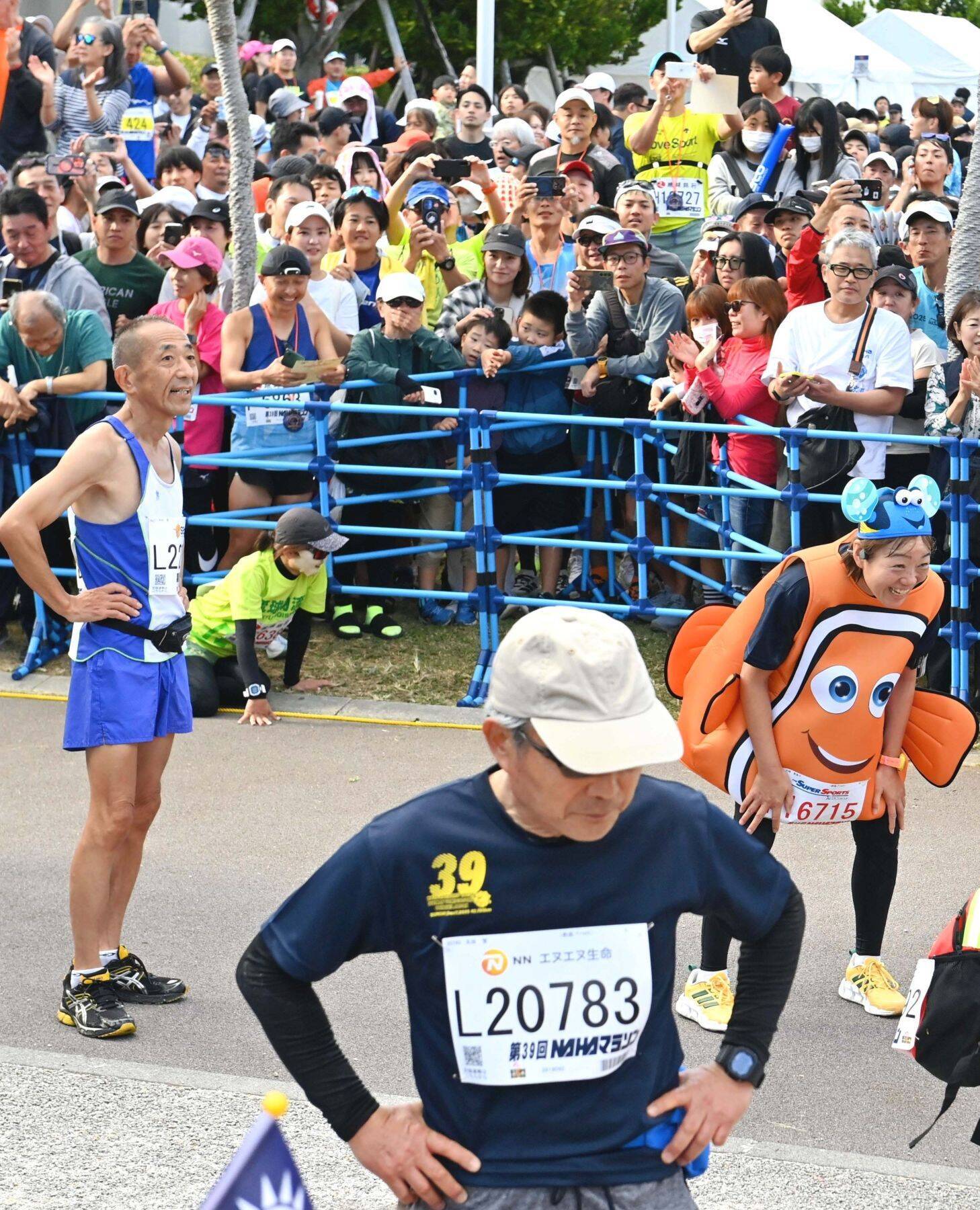 閉ざされた競技場の門の前で、ジョガーたちが肩を落としていました=7日、那覇市・奥武山公園(喜屋武綾菜撮影)