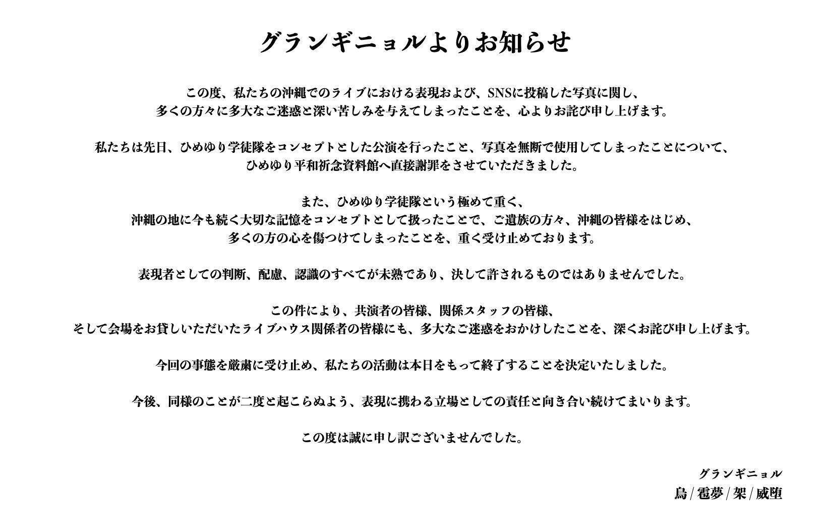 バンドは公式Xで、「ひめゆり学徒隊という極めて重く、沖縄の地に今も続く大切な記憶をコンセプトとして扱ったことで、ご遺族の方々、沖縄の皆さまをはじめ、多くの方の心を傷つけてしまったことを重く受け止めている」と説明。「表現者としての判断、配慮、認識のすべてが未熟で、決して許されるものではなかった」と記した。
