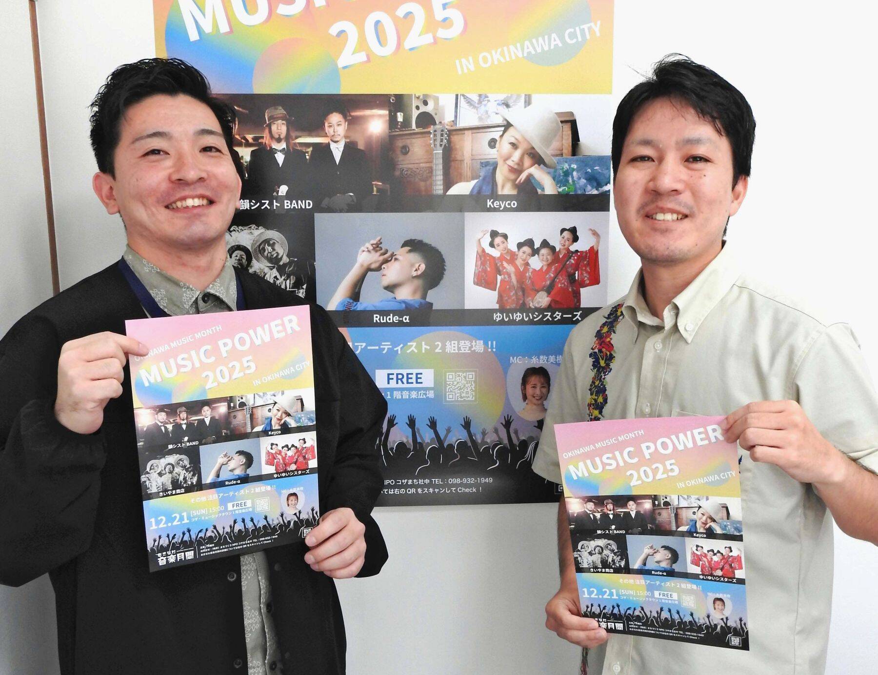 同事業を受託するまちづくりNPOコザまち社中の石原大知さん(32)と市文化芸能課の仲宗根一樹さん(26)が11月28日、沖縄タイムス中部支社を訪れ、イベントをPR。「沖縄市では地域のにぎわい創出を目的に10月から12月を『おきなわ音楽月間』と位置付けてイベントを実施してきたが、今回が集大成となる。音楽の力を感じてほしい」と来場を呼びかけた。