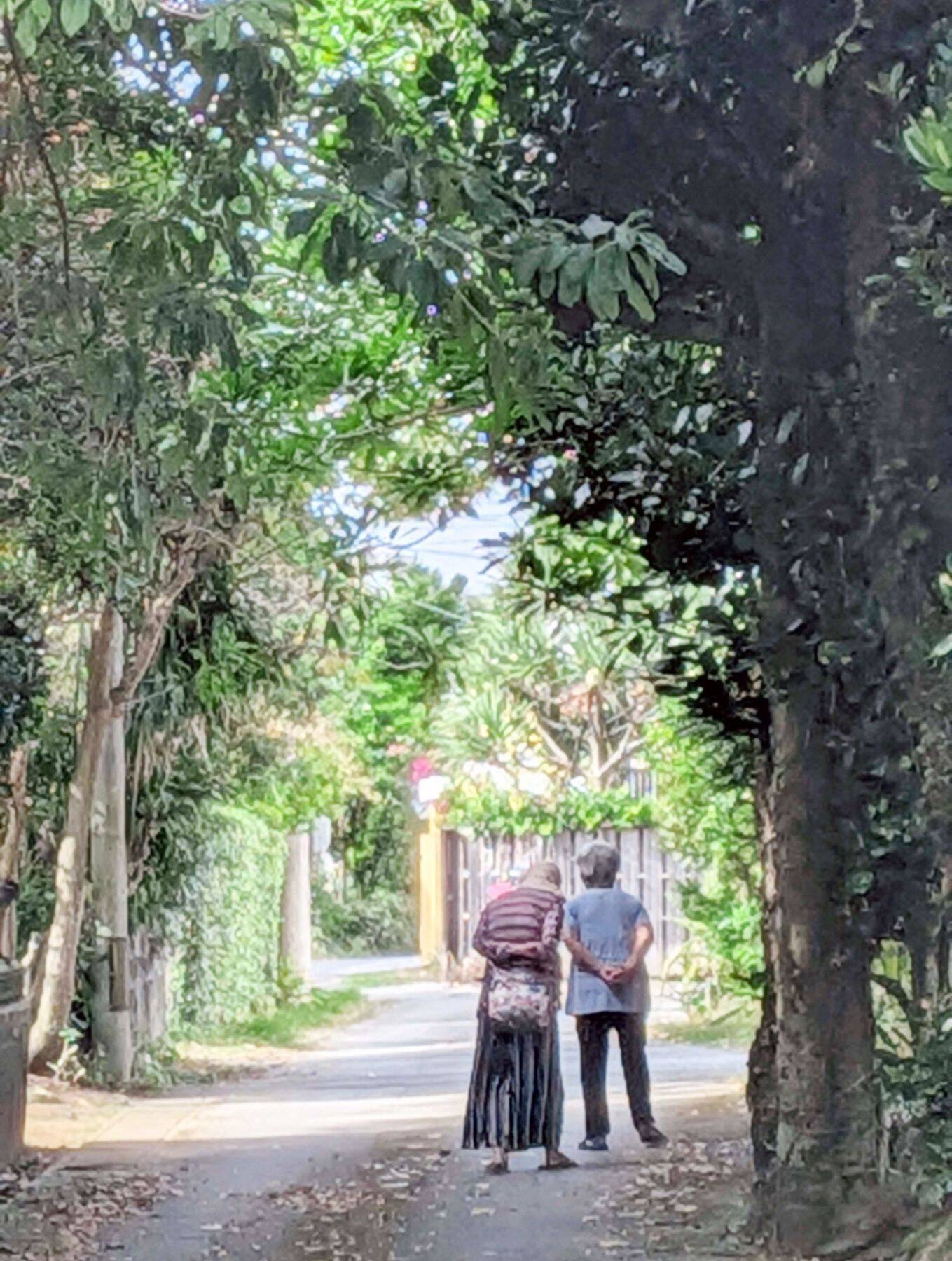 屋我地島・済井出のフクギ並木で、談笑しながらゆっくりと歩みを進める2人の女性。