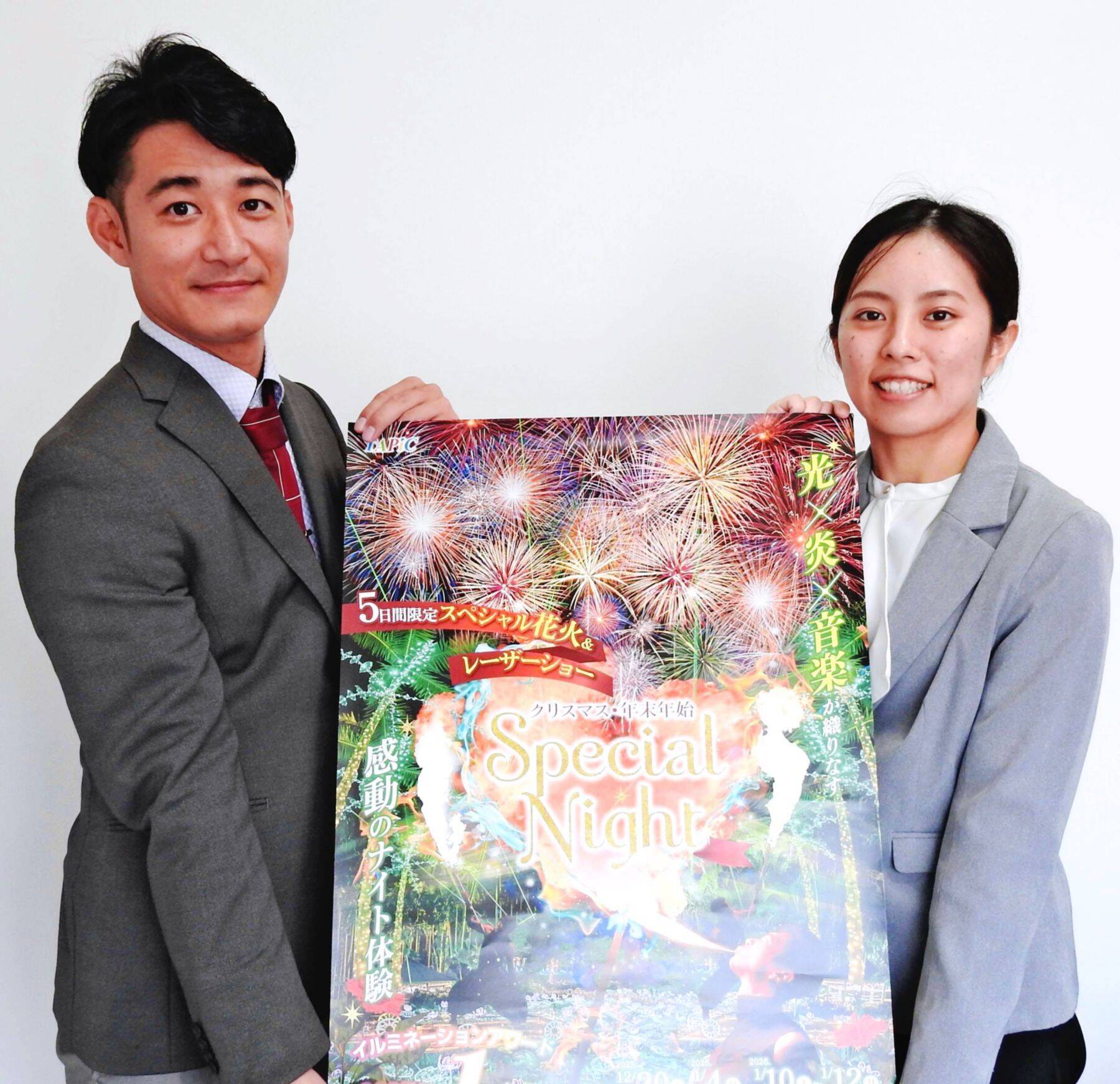 同園セールス・マーケティング部の比嘉恭平さん=写真左=と高江洲愛香さん=同右=は11日、沖縄タイムス中部支社を訪れ「クリスマスや年末年始に感動を味わってほしい」と来場を呼びかけた。