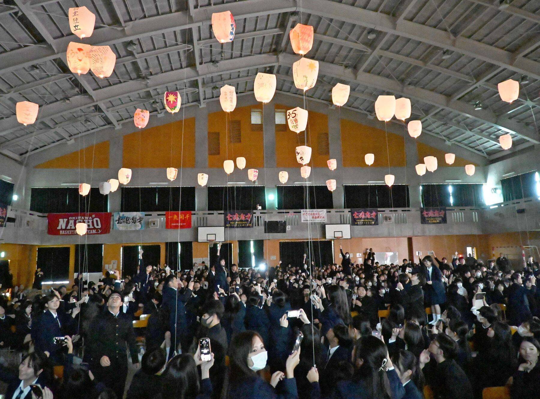「検定合格」「祝120周年」「ずーっと仲良く」。ランタンは全クラスに配られ、生徒が思い思いに寄せ書きをした。クラス全員の名前や担任教師の似顔絵が描かれたランタンもふわりと宙に上がった。