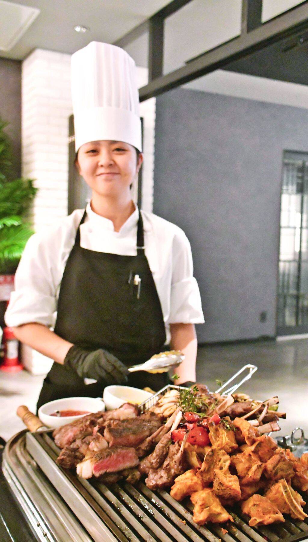 国産牛リブロース、きびまる豚スペアリブ、島豚ソーセージ、スパイシーチキンなどをシェフがチャコールグリルワゴン(炭焼きワゴン)で回って提供する。