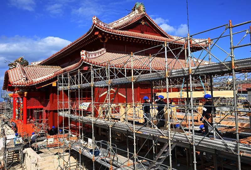 そのほか県は、オーバーツーリズム対策の一環として、首里城公園駐車場の予約制度を22日から実験的に導入している。(政経部・田中青葉)(資料写真)復元作業が進む首里城正殿=2025年12月">