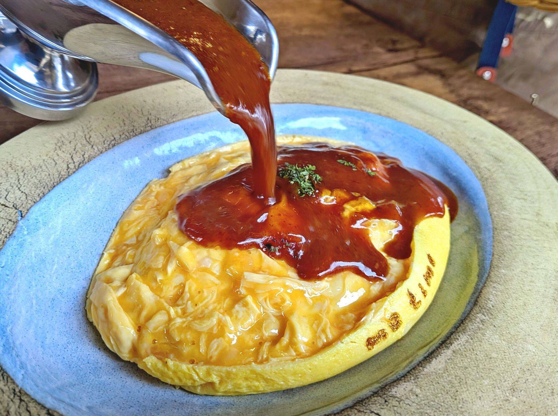 とろとろ半熟のオムライスに特製デミグラスをそそぐ